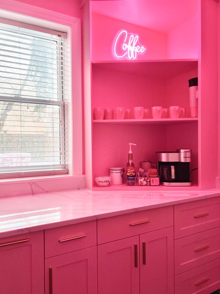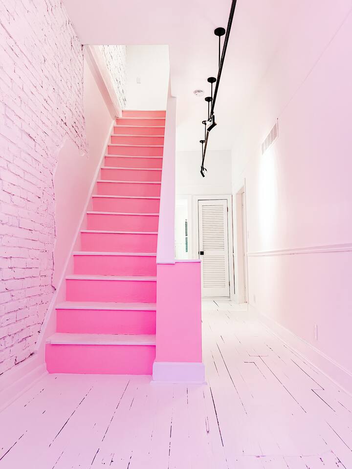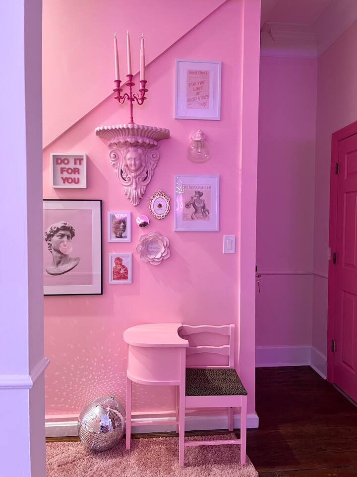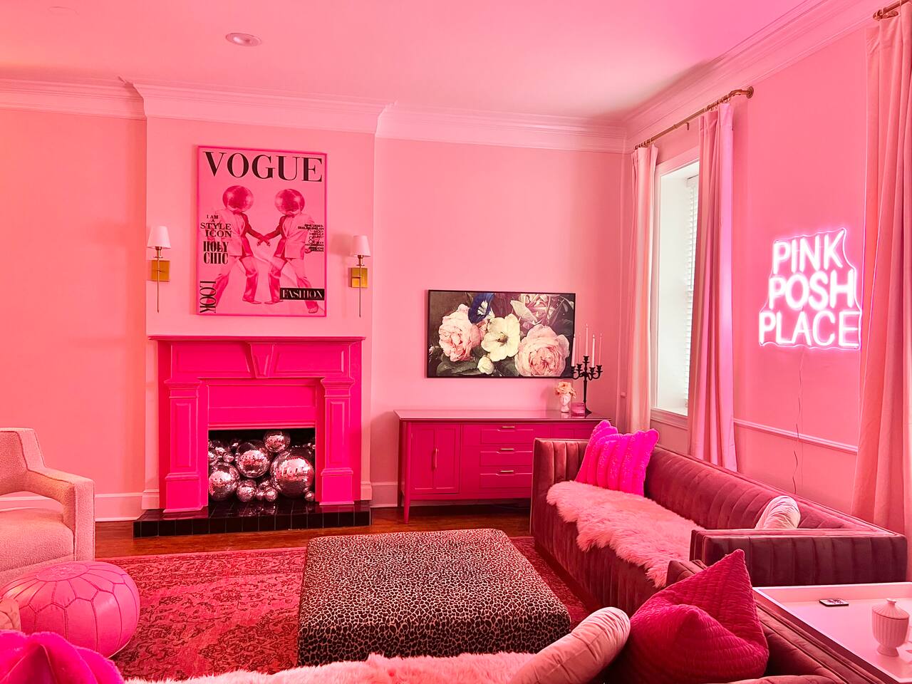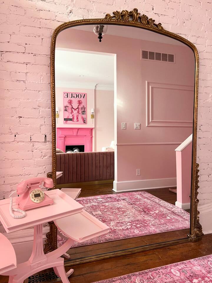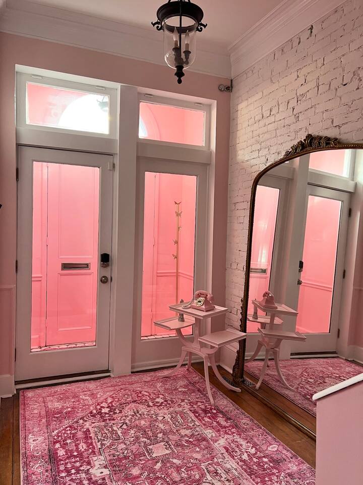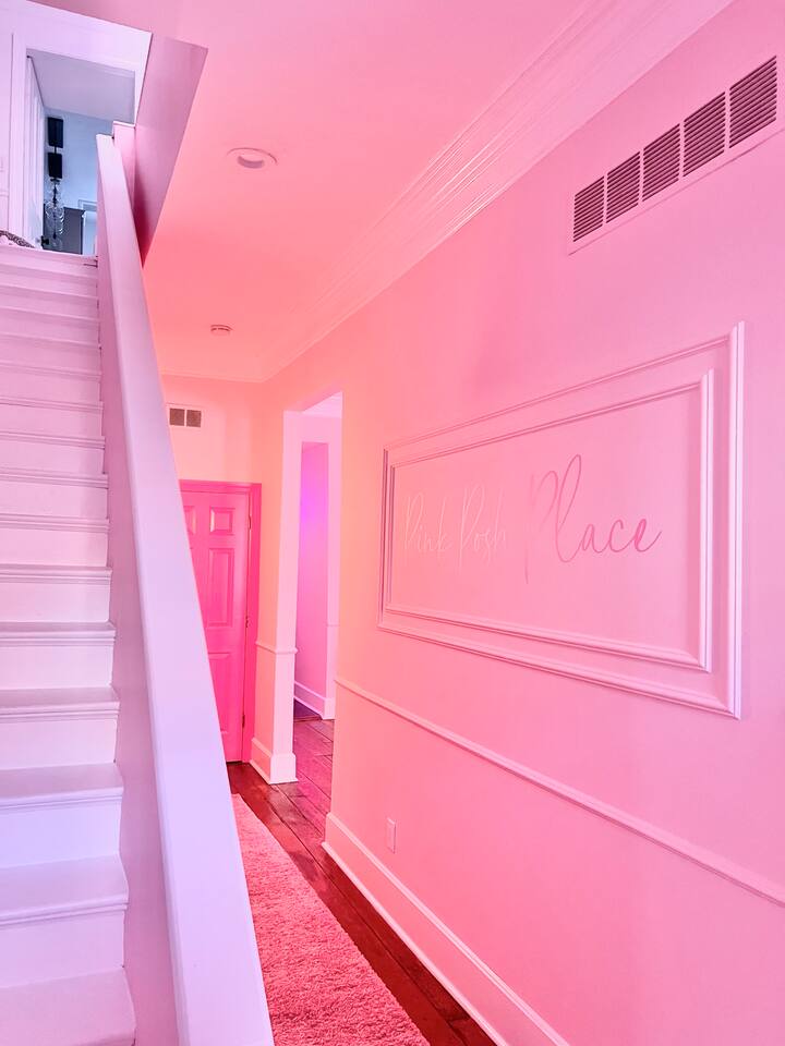 This 3-story private home is a gem! PINK POSH PLACE is a luxurious and spacious home drenched in natural light and shades of pink! There is plenty of room for everyone to spread out. BEDROOMS: Three large bedrooms are all located on the top two floors. There are lots of places to get ready with multiple make-up mirrors throughout. - 1st bedroom has a king-size bed and a lovely private deck that leads to the magical courtyard. - 2nd bedroom has two queen-size beds. There is a cheetah chase lounge and reading nook outside of this room. - 3rd bedroom is the entire third floor, consisting of two queen beds, a full bathroom, plus a coffee and wet bar! Total slumber party dream!! BATHROOMS: - 1st Full Bathroom is XL and is located on the second floor with a large shower. - 2nd Full Bathroom is on the 3rd floor with a shower. - 1/2 bathroom is on the main level at the end of the hall. PINK KITCHEN: The fully stocked pink kitchen has all stainless appliances, pink cookware, bakeware, a variety of glassware, all the pink dishes and things you would need, plus a large pink coffee bar (includes Kuerig K-cups, drip coffee, and a French press)! We are located only a few footsteps to fun restaurants, cafes, and bars! This location is serioulsy prime and ready for you to make some amazing memories! No "parties" allowed. But it's the perfect space to hang out and enjoy with your group! Please let us know what your plans are for your stay when you are booking the space. We also rent this home for photoshoots, content creation rentals, and very intimate events. (MUST BE APPROVED WHEN BOOKING YOUR RESERVATION)