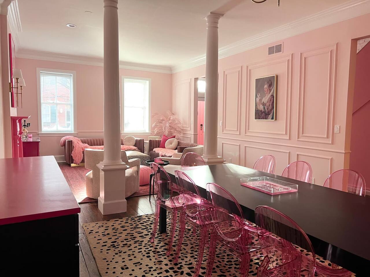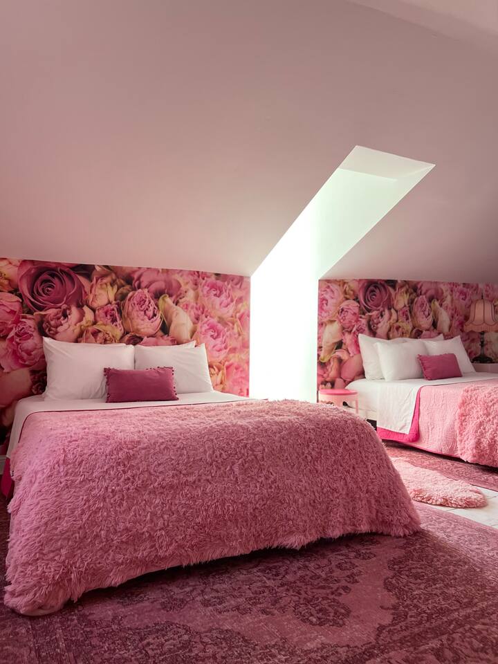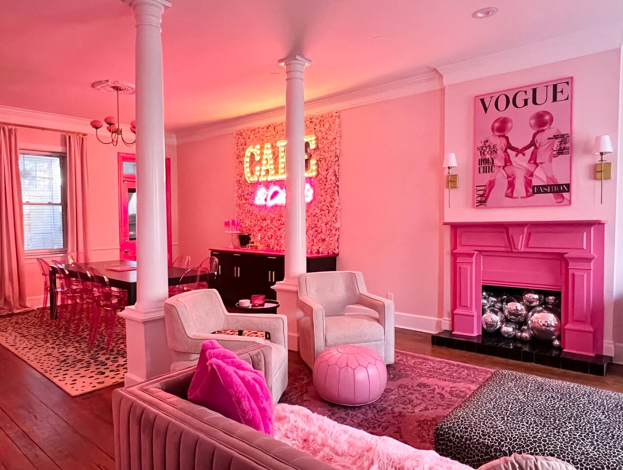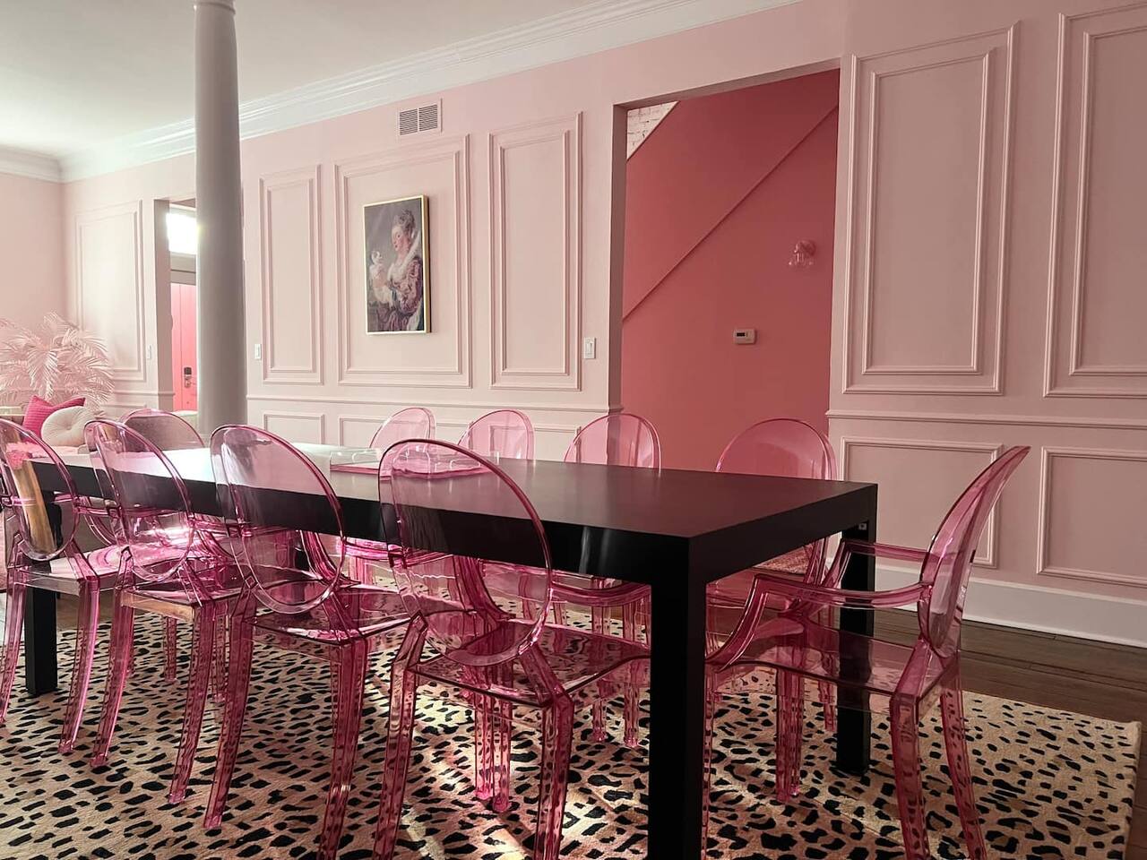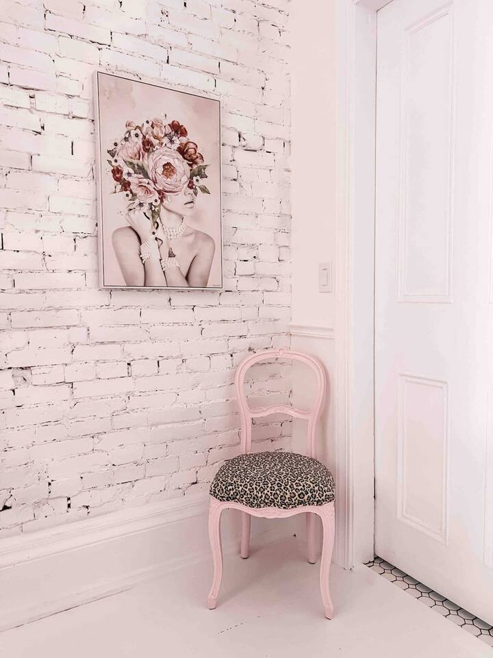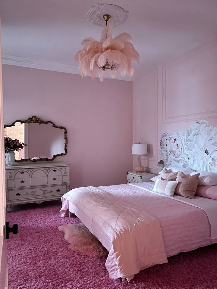 This 3-story private home is a gem! PINK POSH PLACE is a luxurious and spacious home drenched in natural light and shades of pink! There is plenty of room for everyone to spread out. BEDROOMS: Three large bedrooms are all located on the top two floors. There are lots of places to get ready with multiple make-up mirrors throughout. - 1st bedroom has a king-size bed and a lovely private deck that leads to the magical courtyard. - 2nd bedroom has two queen-size beds. There is a cheetah chase lounge and reading nook outside of this room. - 3rd bedroom is the entire third floor, consisting of two queen beds, a full bathroom, plus a coffee and wet bar! Total slumber party dream!! BATHROOMS: - 1st Full Bathroom is XL and is located on the second floor with a large shower. - 2nd Full Bathroom is on the 3rd floor with a shower. - 1/2 bathroom is on the main level at the end of the hall. PINK KITCHEN: The fully stocked pink kitchen has all stainless appliances, pink cookware, bakeware, a variety of glassware, all the pink dishes and things you would need, plus a large pink coffee bar (includes Kuerig K-cups, drip coffee, and a French press)! We are located only a few footsteps to fun restaurants, cafes, and bars! This location is serioulsy prime and ready for you to make some amazing memories! No "parties" allowed. But it's the perfect space to hang out and enjoy with your group! Please let us know what your plans are for your stay when you are booking the space. We also rent this home for photoshoots, content creation rentals, and very intimate events. (MUST BE APPROVED WHEN BOOKING YOUR RESERVATION)