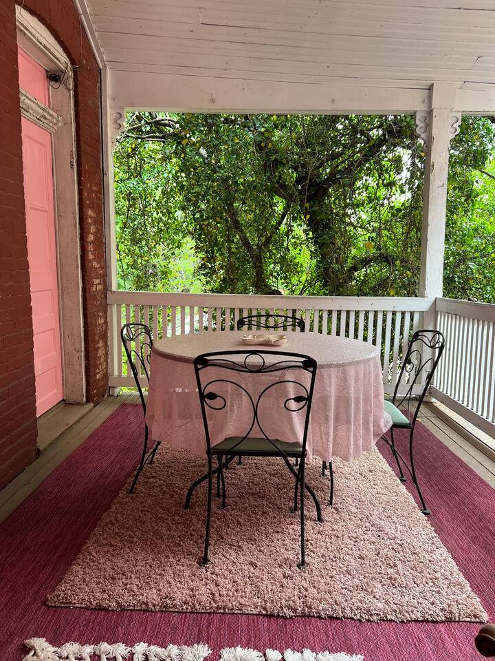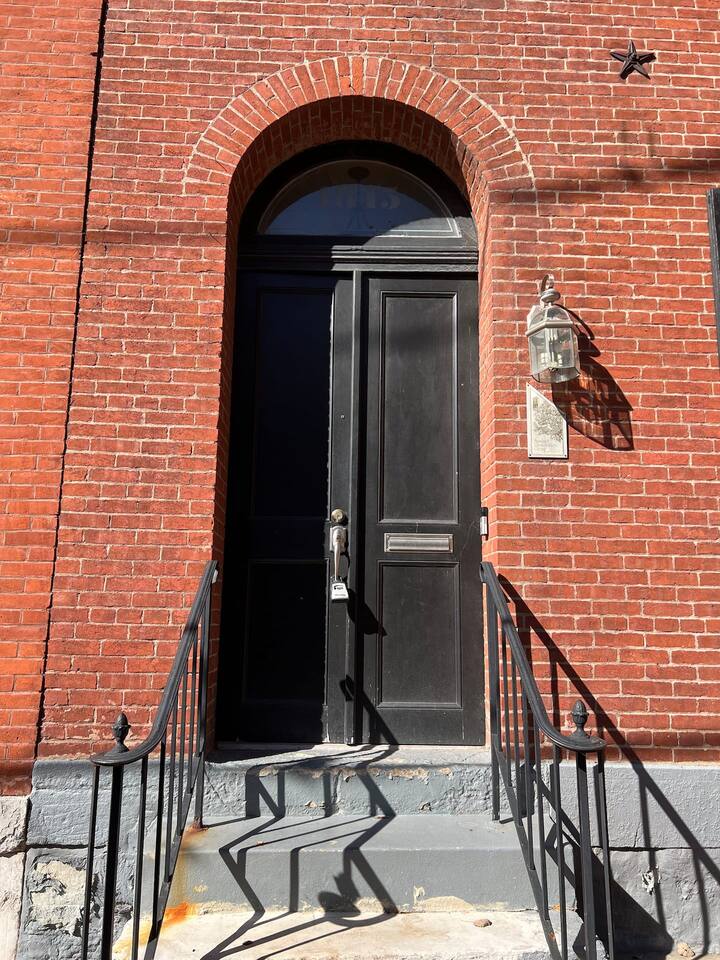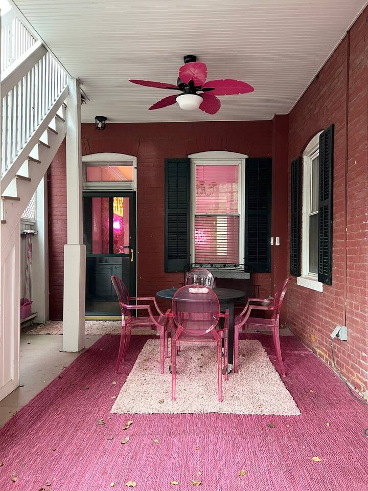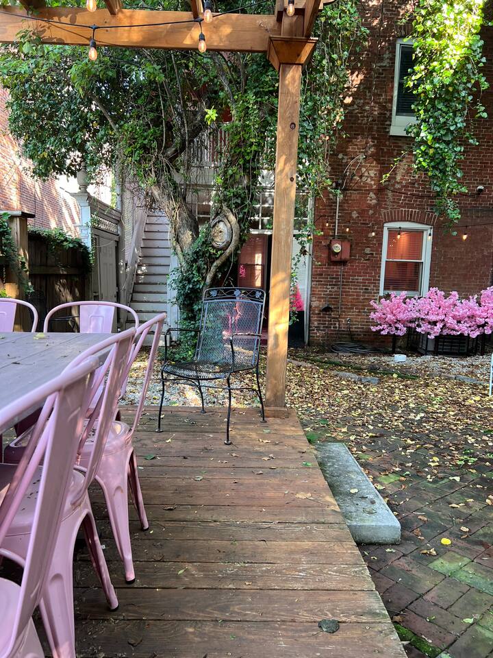 There are two wood-painted staircases in this home. They are old and charming... (the staircase to the 3rd floor is a little steep). Large private courtyard in the back with a ground-level deck, pergola, party lights, and lots of outdoor seating for dining and chillin'. We are located on one of the best corners in the heart of the neighborhood (across from 1860's Saloon) which draws a lot of people. This is a destination "nightlife" area and is an amazing location! (Potential for outside noise, but the charming location is unbeatable)!